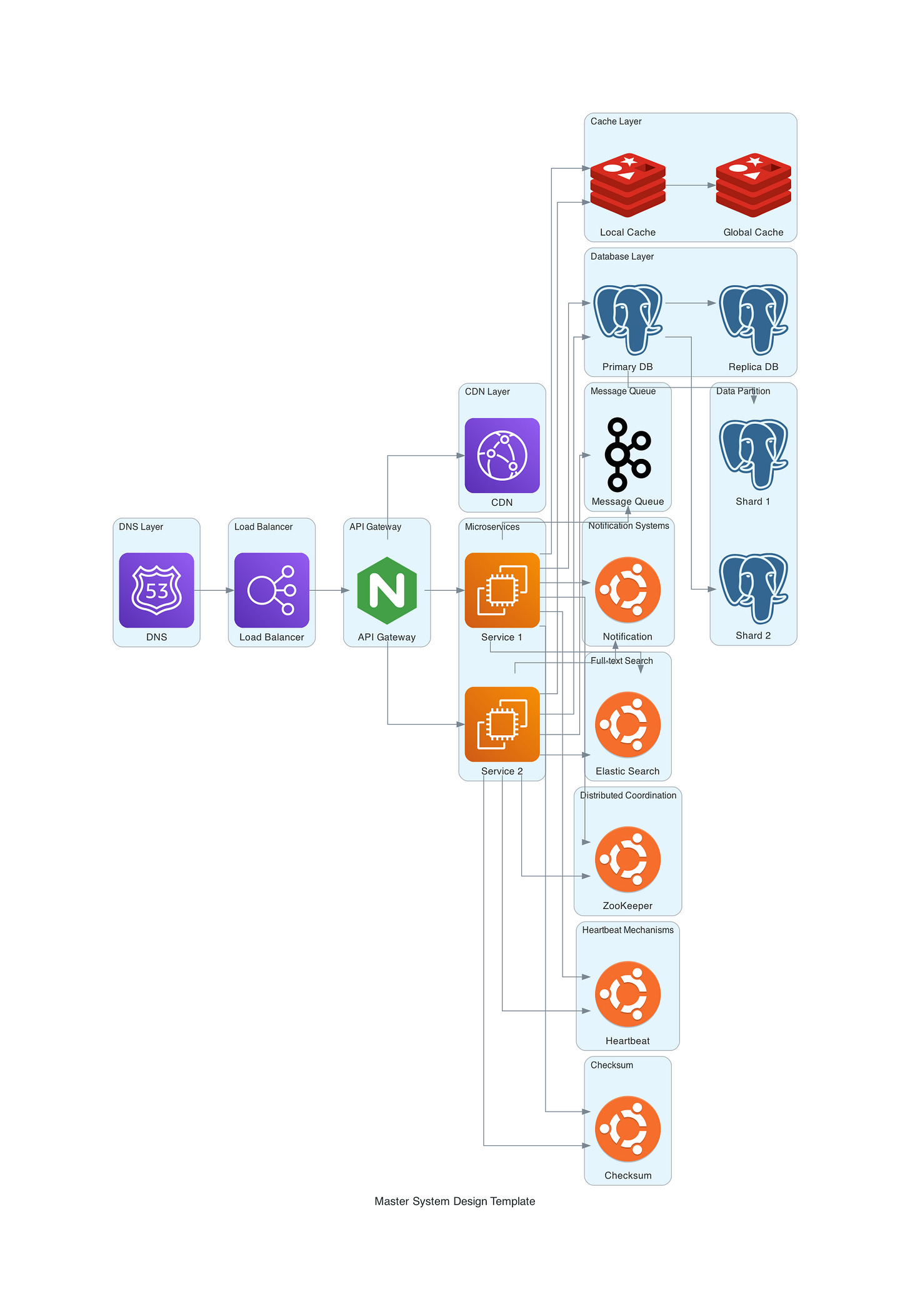 Let's kick things off with the DNS Layer. Think of it as your system's reception desk, translating user-friendly domain names into IP addresses. We used AWS Route53 in our template for this purpose, setting the stage for user requests to navigate through the system.